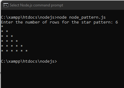 Here’s a Node.js program that takes user input to print a star pattern. We will prompt the user to enter the number of rows they want in the pattern and then generate the pattern accordingly.