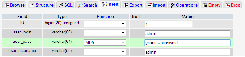 Click the edit (pencil) button -> change the password in ‘user_pass‘ -> select MD5 in the column Function drop down as shown below: