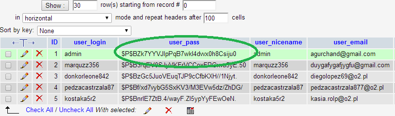 So first login to your phpMyAdmin and find the table ‘wp_users’ or ‘anyprefix_user‘ then click the link to open the table, you will see the list of usernames and passwords like this: